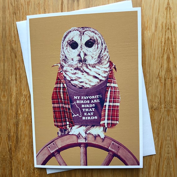 A barred owl in a flannel shirt posing for a vintage portrait is sure to brighten someone's day. Barred owl's custom T-shirt reads: My favorite birds are birds that eat birds.